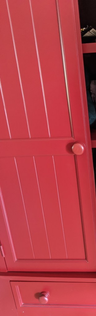 My former mother-in-law gave us an armoire. It’s red. I like it. I don’t like it near the dining area. It’s going in the kitchen across from the pantry. That will be a tight walkway, but I’m letting my hanging spice racks go and probably not rehanging the black floating shelves. After removing both the spice racks and the shelves, I realized that they never really stay clean and oil, spices and vinegar needs to be out of sight.